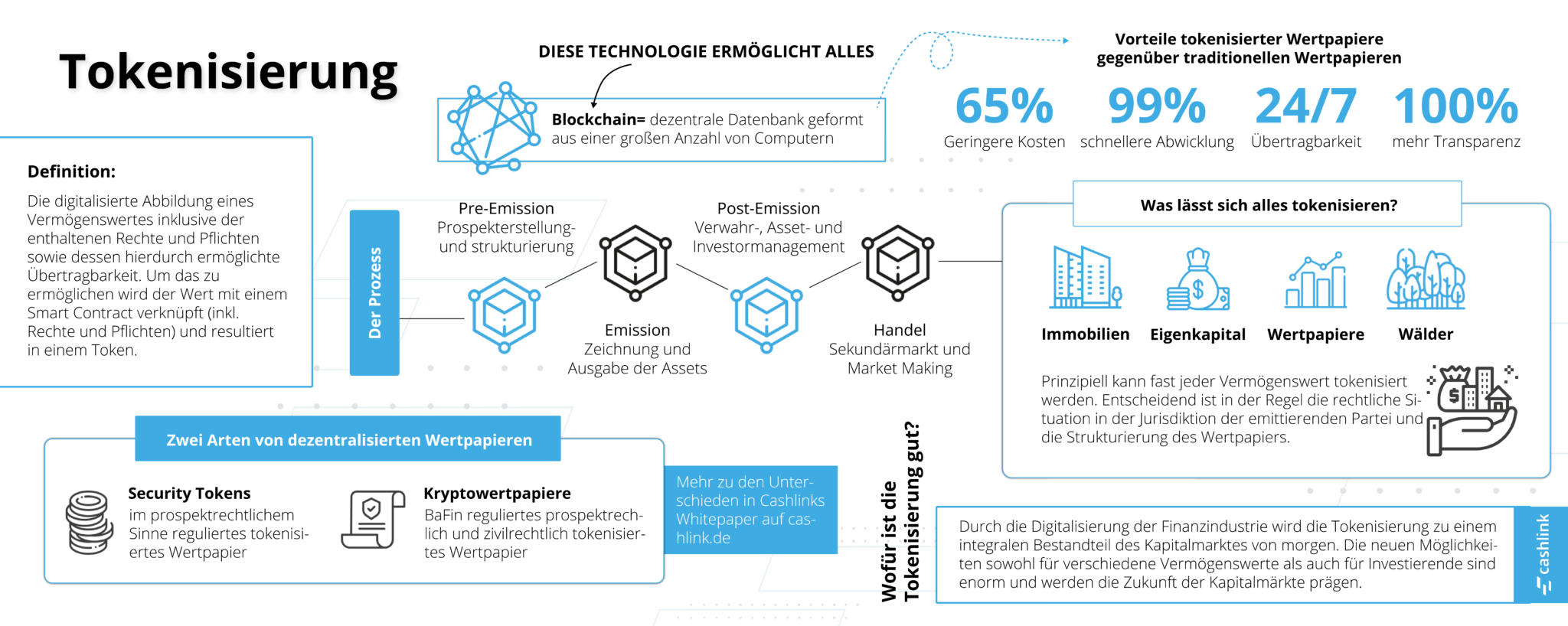 Tokenisierung bildet Vermögenswerte über eine Blockchain digital ab. Reale Vermögenswerte, einschließlich der verbundenen Rechte und Pflichten, werden mit der Blockchain-Technologie digital dargestellt. Um einen Vermögenswert auf der Blockchain abzubilden, werden so genannte Security Token ausgegeben. Diese stellen einen bestimmten Anteil des grundlegenden Wertes dar. So können regulierte Finanzinstrumente wie Aktien, Anleihen oder Fonds, aber auch materielle Vermögenswerte wie Immobilien dargestellt werden. Durch das neue Gesetz für elektronische Wertpapiere (eWpG) können auch sogenannte ausgegeben werden.
